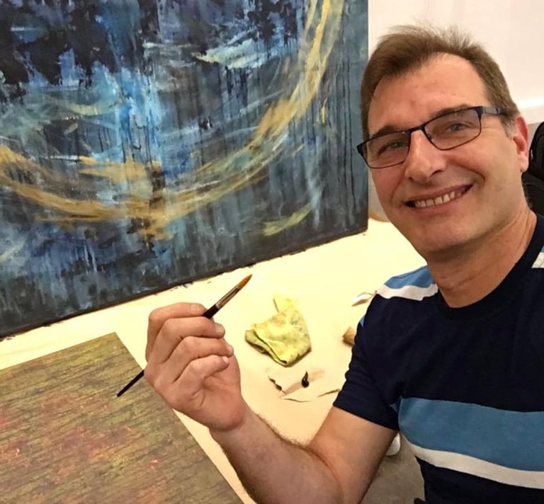 Abogado en Venezuela, su pasión por el arte nunca lo abandonó y se convirtió en coleccionista. Compra a jóvenes artistas venezolanos y pinturas y obras de arte francesas. Es llevado a dejar su tierra natal por la tierra de su corazón, Francia, donde su pasión por la creación lo alcanza. Se matriculó en la Sorbona para tomar cursos. En vista de su talento, sus profesores de artes plásticas lo animaron a iniciar su vida como pintor profesional. La pintura acrílica, sobre lienzo o sobre papel, le permite expresarse libremente, más que cualquier otro medio. De hecho, le permite mostrar luz, profundidad y textura, tres principios inseparables de su enfoque artístico. Pinta intuitivamente, colocando sus sentimientos más íntimos en el objeto exterior representado por el lienzo a la manera de Kandinsky. El uso del movimiento y sus propias sensaciones revela una abstracción en la que todos pueden encontrarse. Esta idea es fundamental para el artista que pide al espectador que se tome el tiempo de sumergirse en la obra y dejar resonar en él el eco de esta vibración emocional.